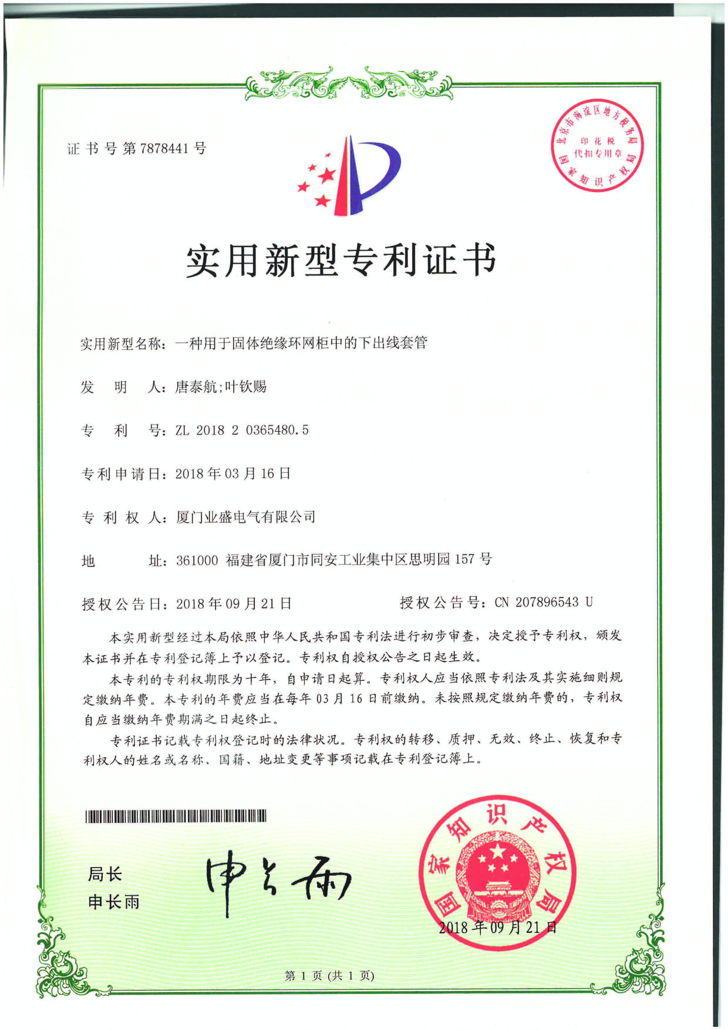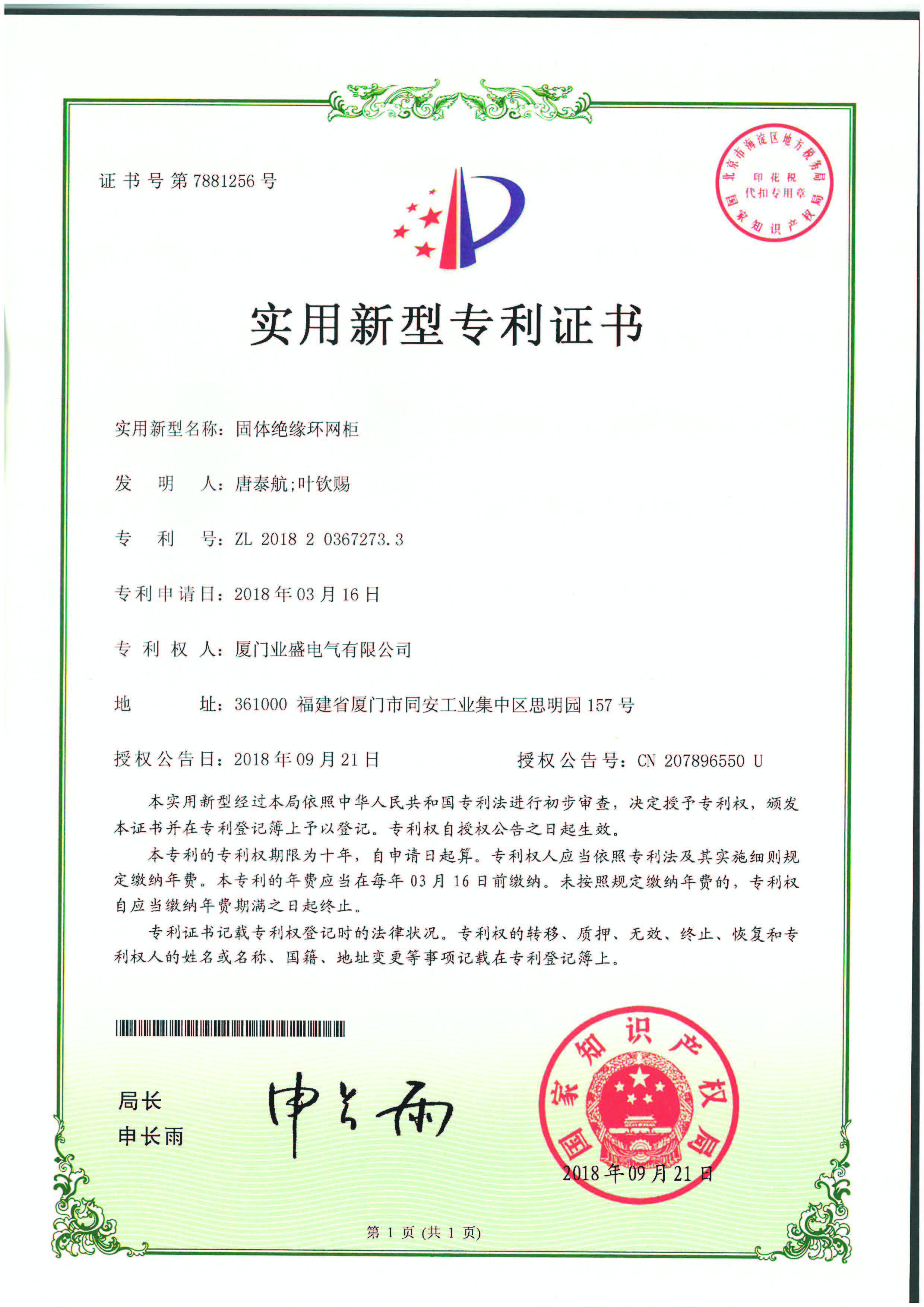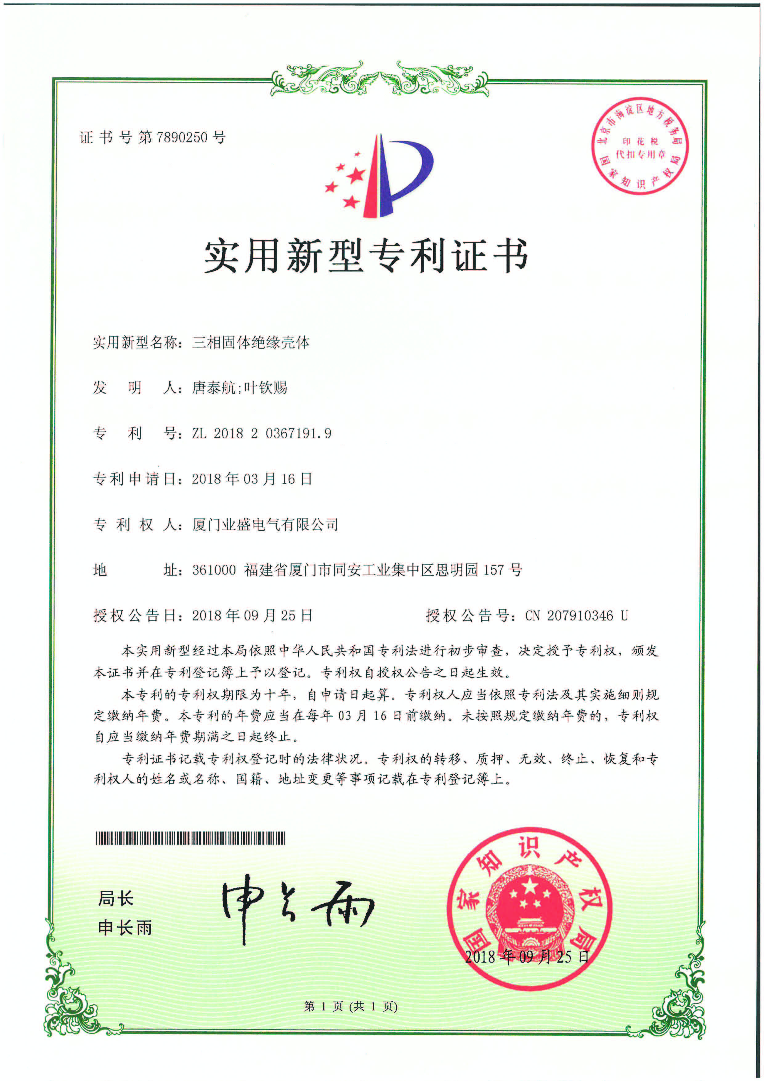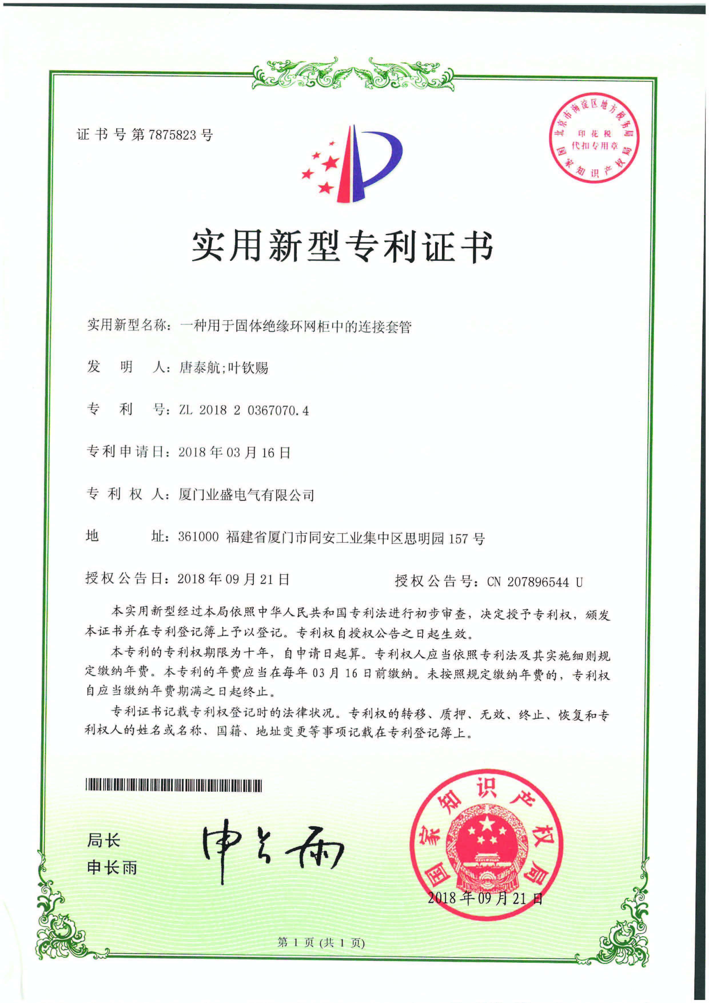 實(shí)用新型專利證書(shū)