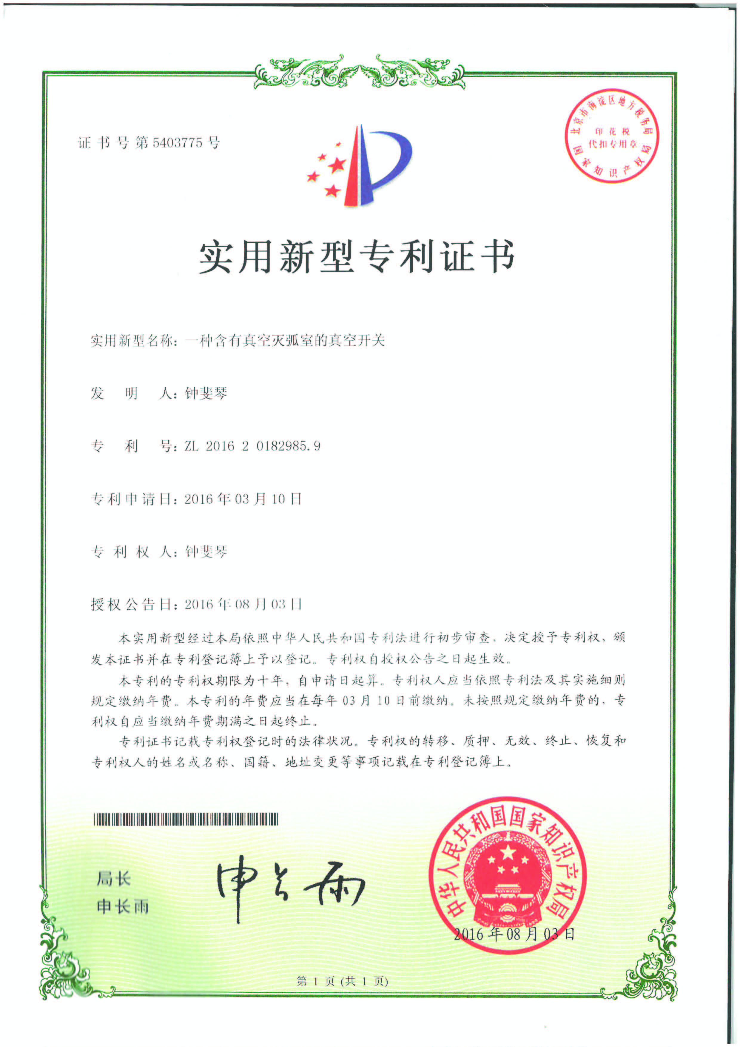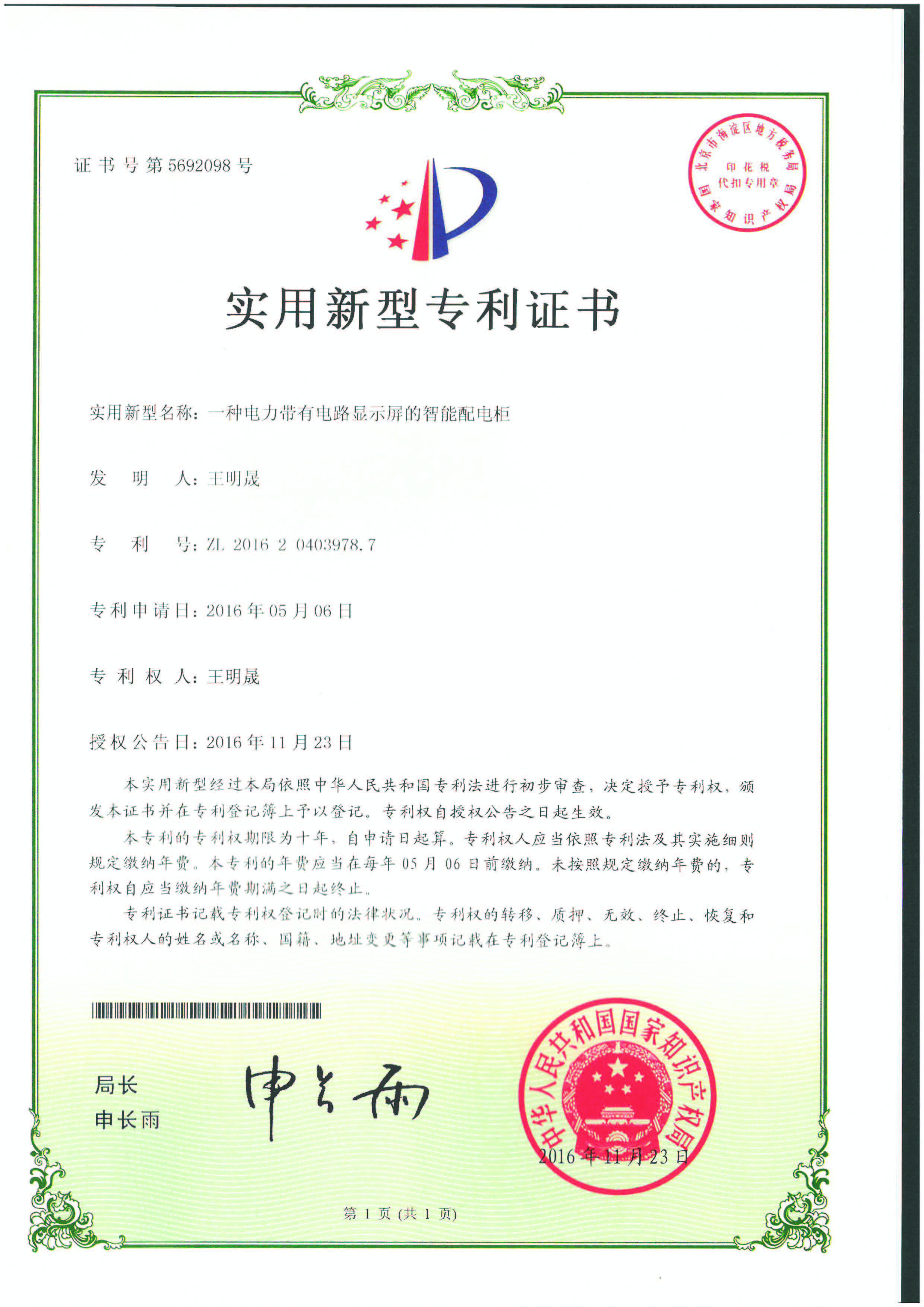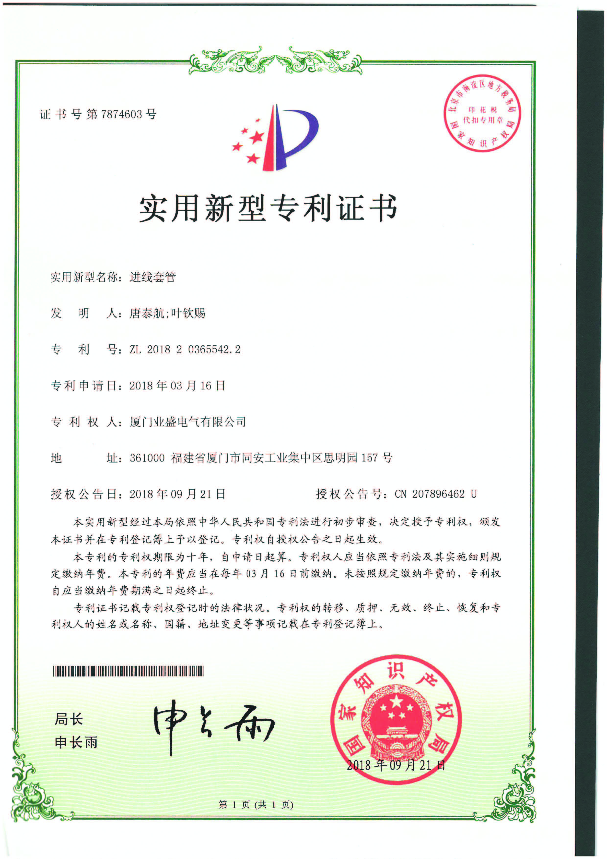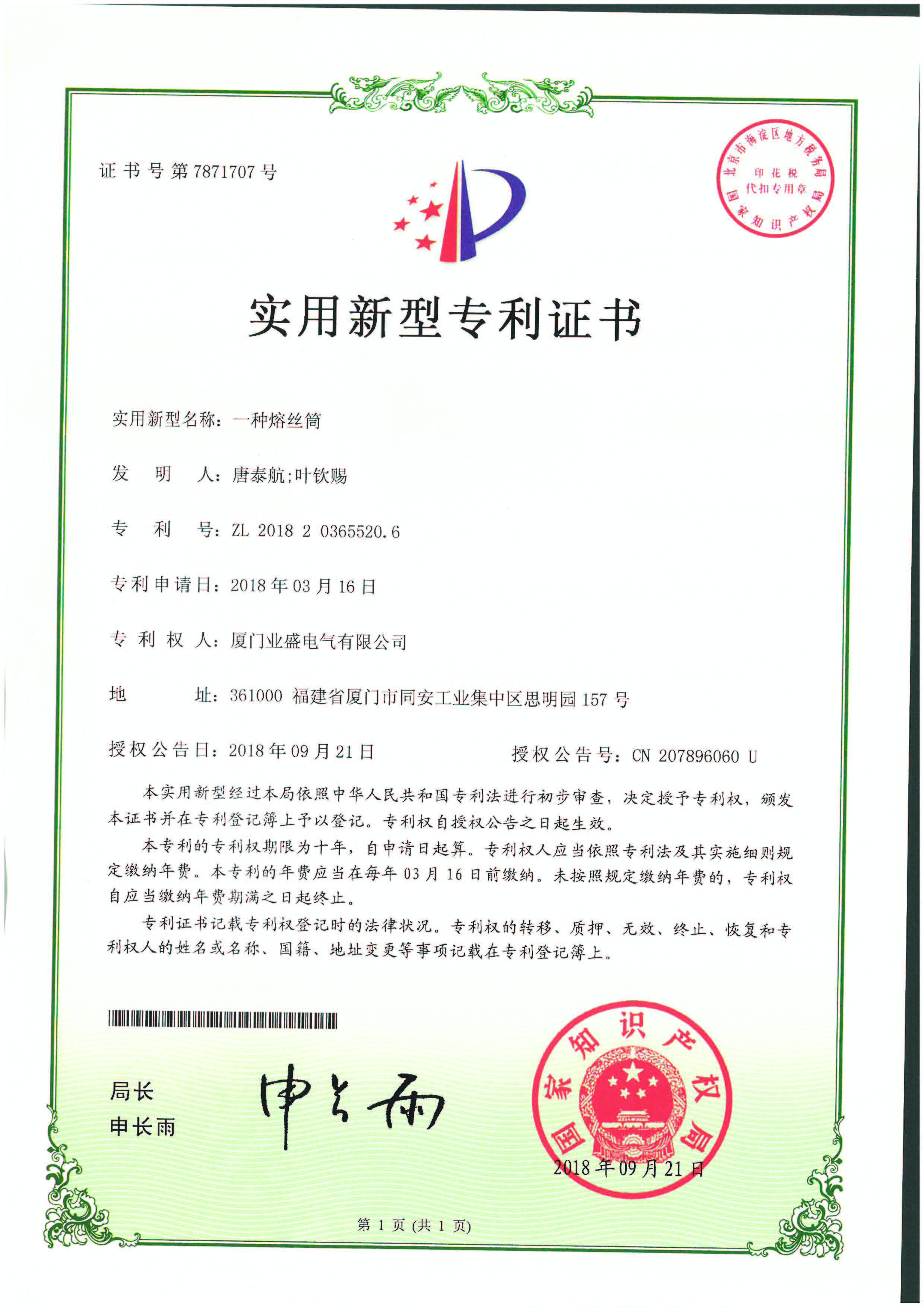 實(shí)用新型專利證書(shū)
